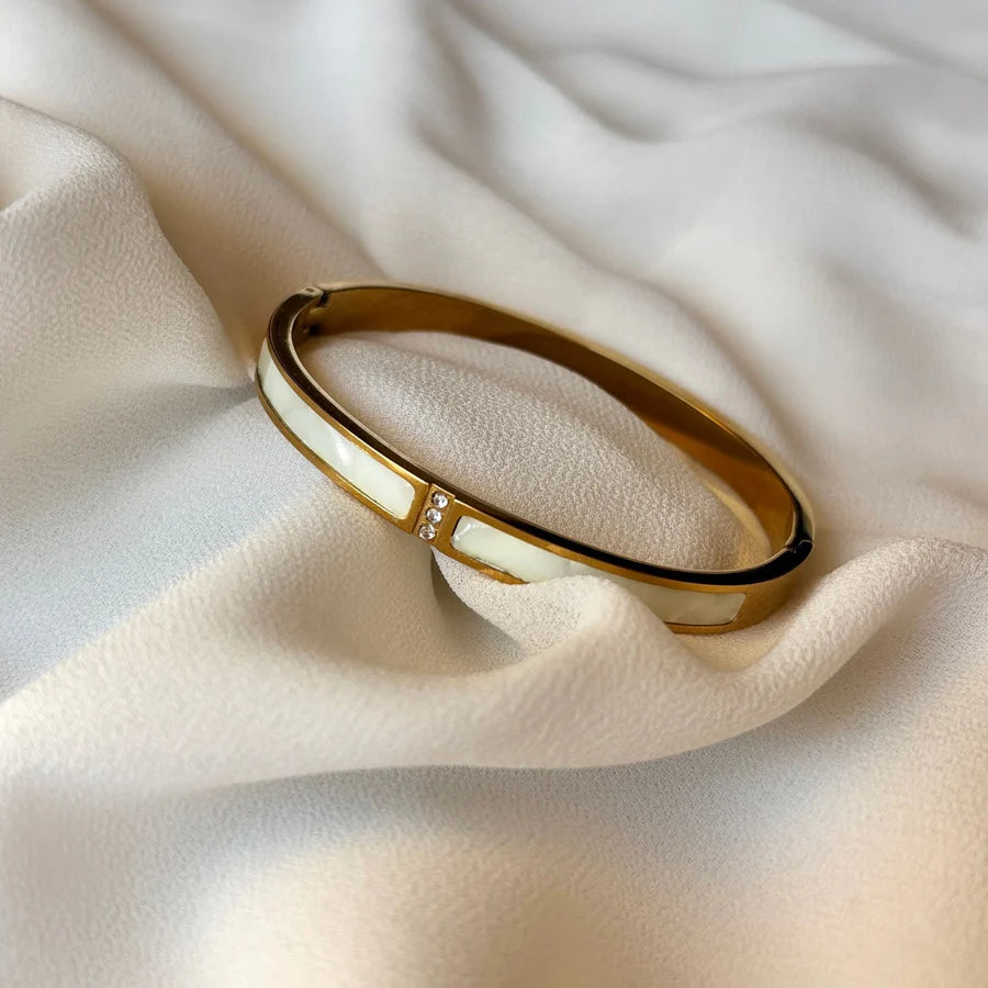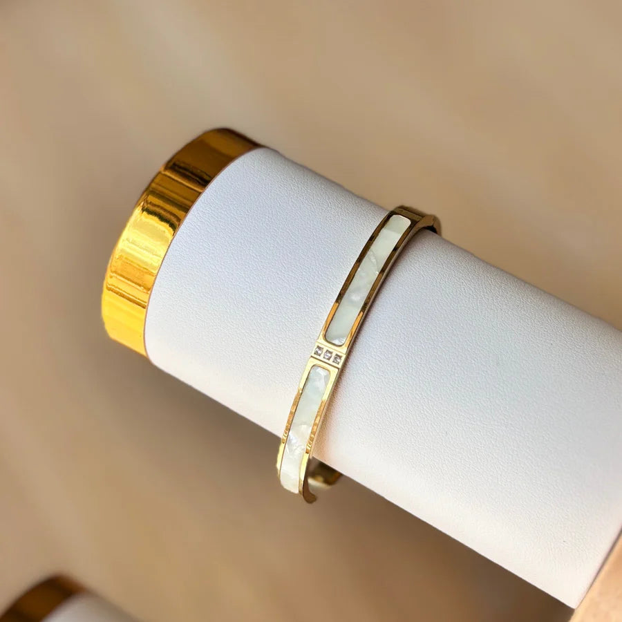 18K Gold-Plated Steel Bangle Bracelet with Mother-of-Pearl and Zircon Details - Waterproof