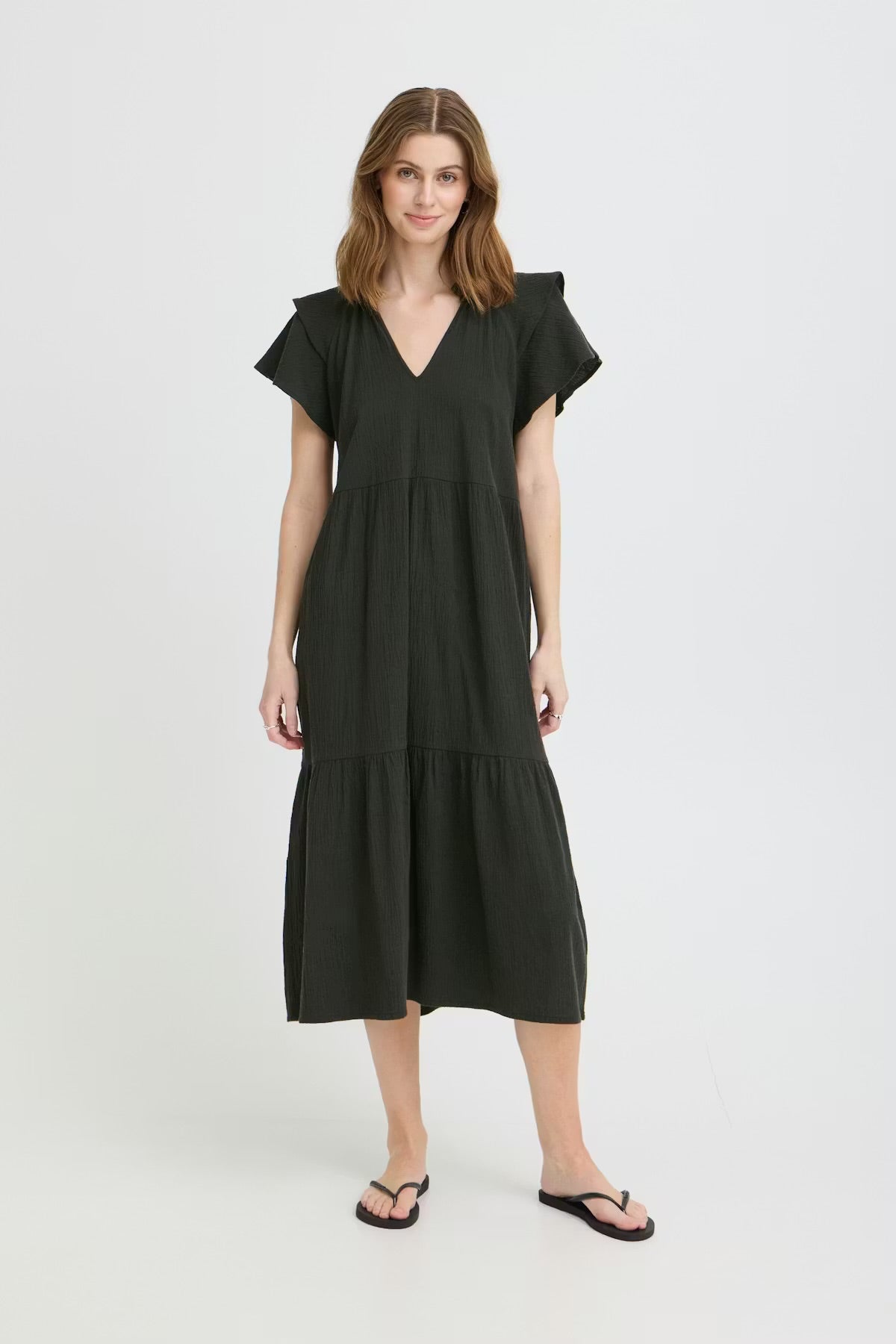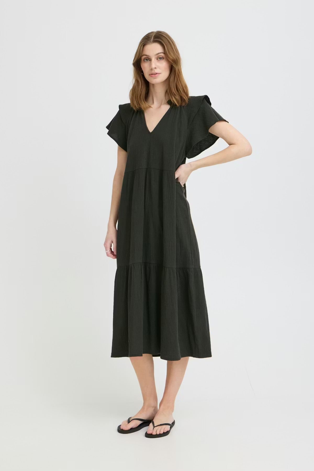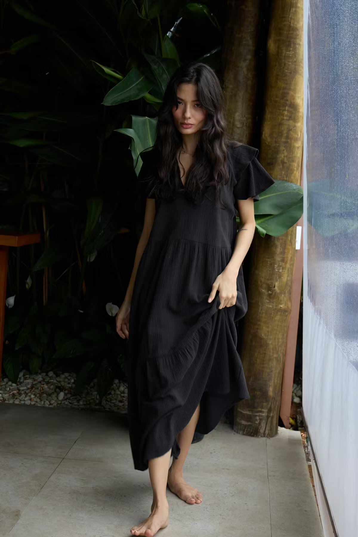 Midi dress with a soft crinkled texture, V-neckline, flutter sleeves, and a relaxed tiered silhouette. Effortlessly cool with flowing drape and a comfortable fit.