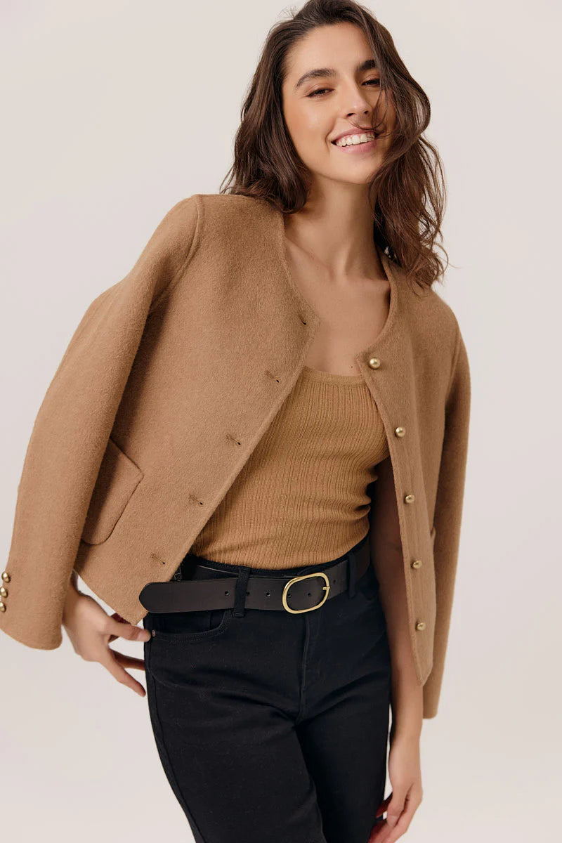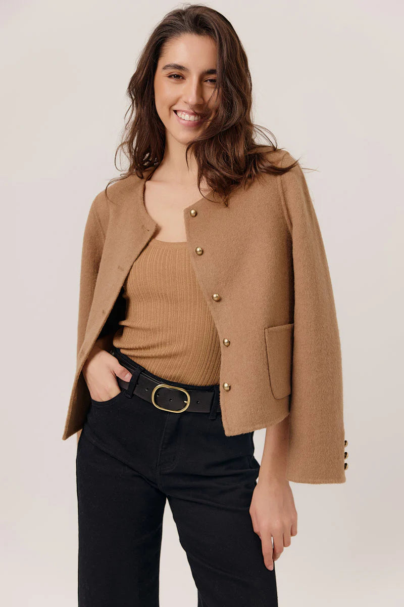This short, round-neck dress fastens with gold buttons and features patch pockets. Its elegant, structured cut makes it a timeless piece, perfect for completing a chic or casual outfit.