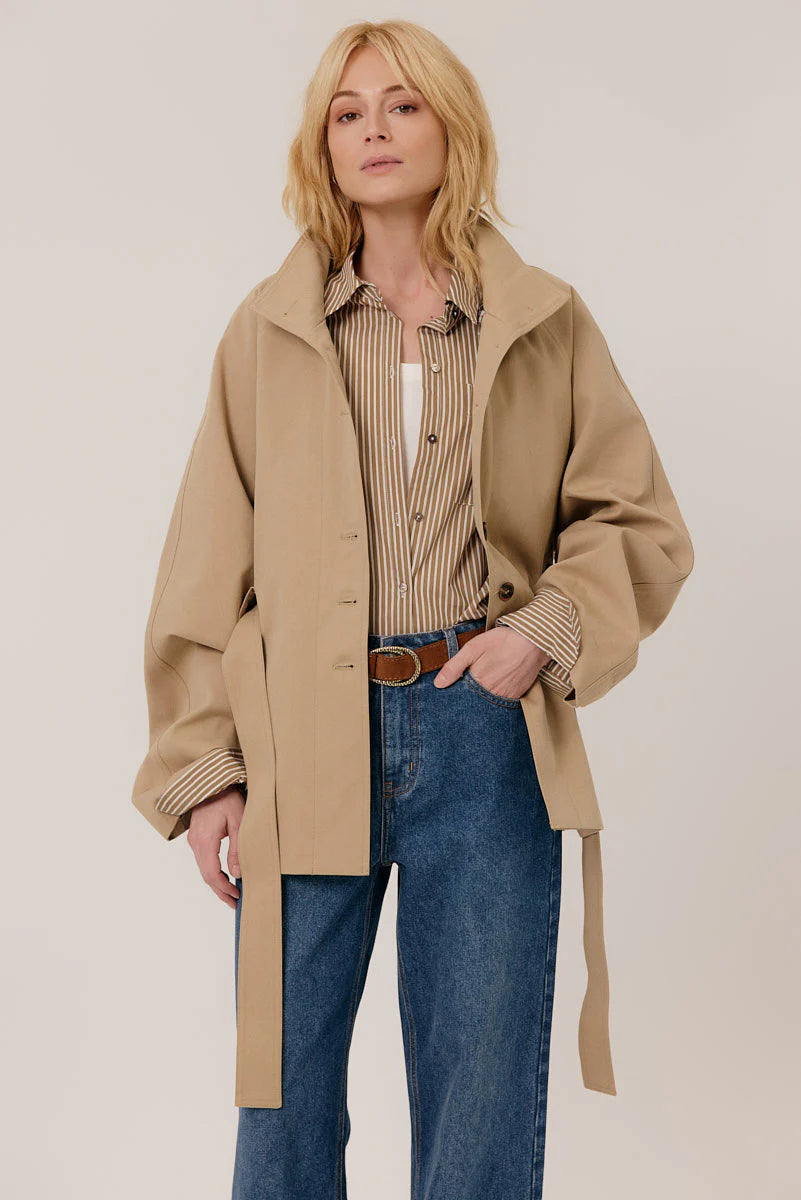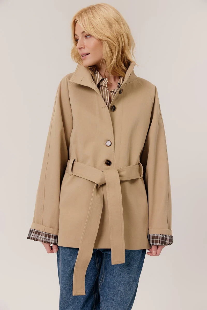 A short, flowing trench coat with a button closure and a tie belt for waist adjustment. Its refined details and stand-up collar make it an elegant and easy-to-wear piece for everyday wear.