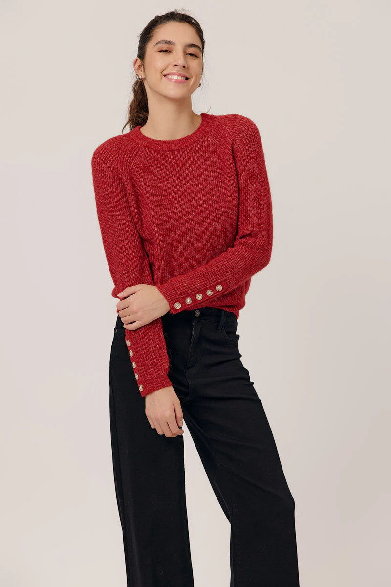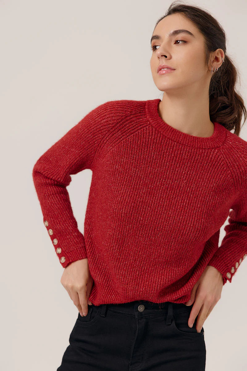 Crew neck sweater in textured knit with button details on the sleeves. A simple piece elevated by a touch of originality, easy to incorporate into any look.