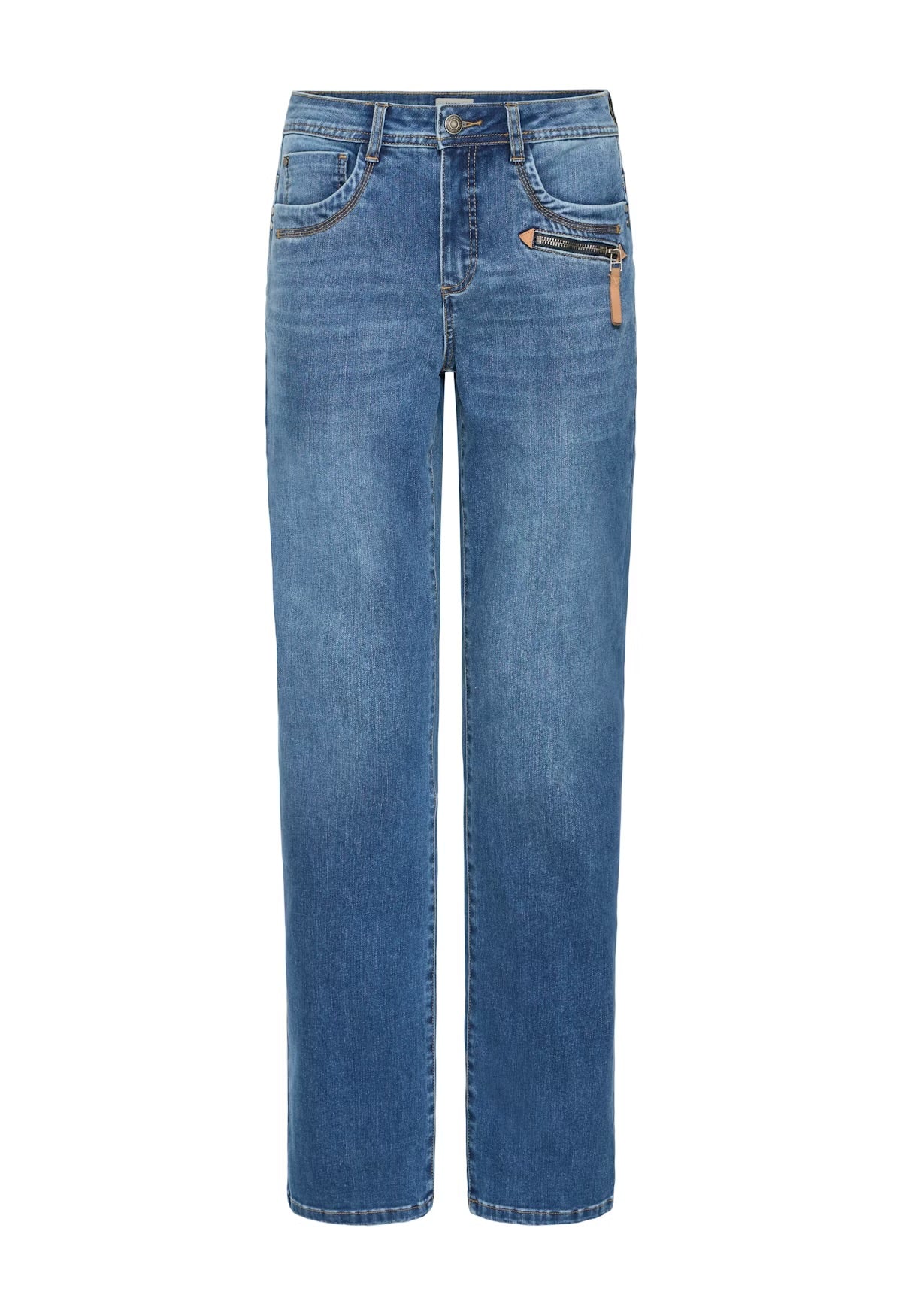 Straight fit denim jeans feature classic five-pocket styling, full-length legs, and a statement zip pocket detail at the hip for modern edge.
