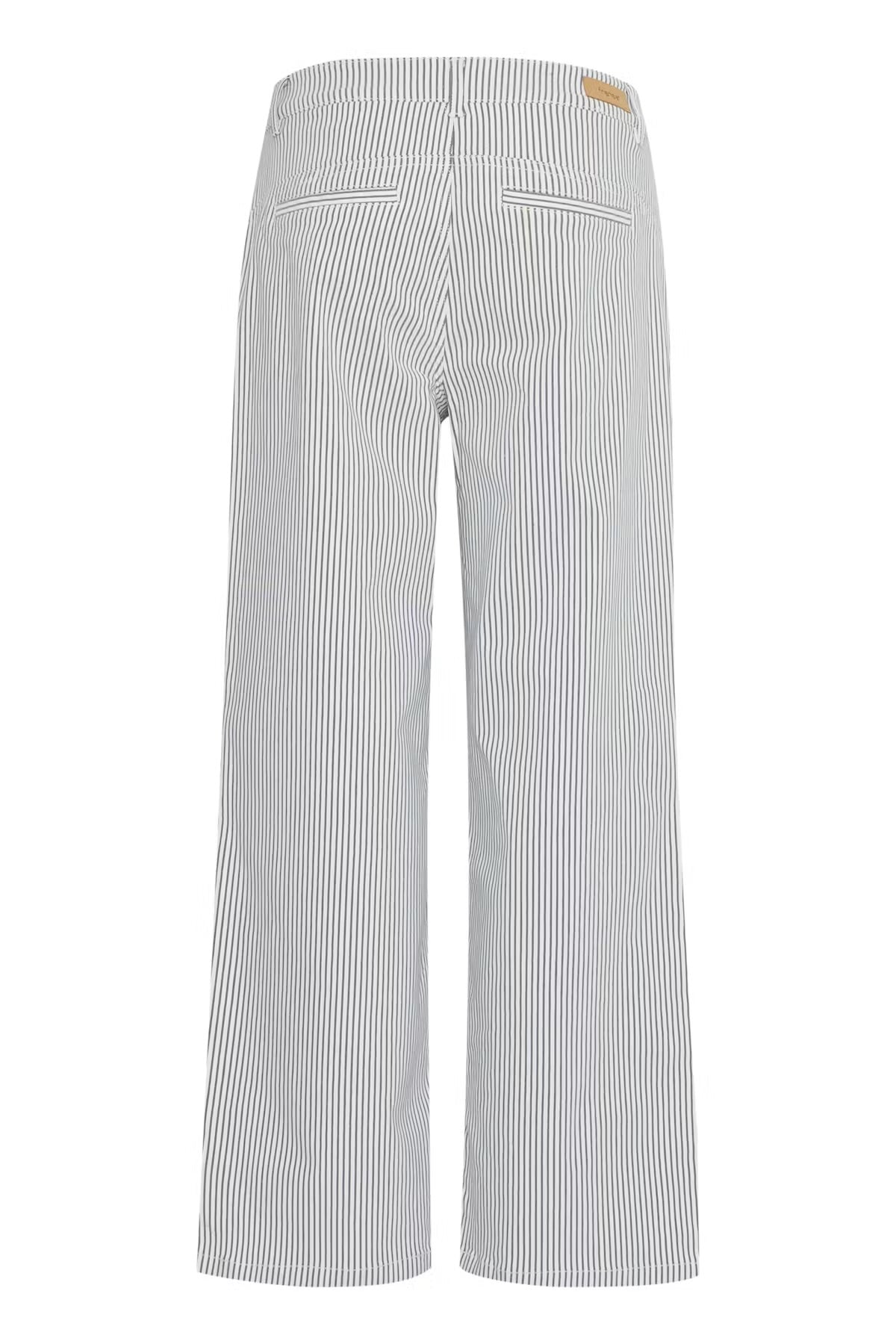 Striped wide leg trousers offer a modern straight fit with a full-length silhouette. Subtle vertical stripes, side pockets, and button fastening bring a clean, streamlined look.