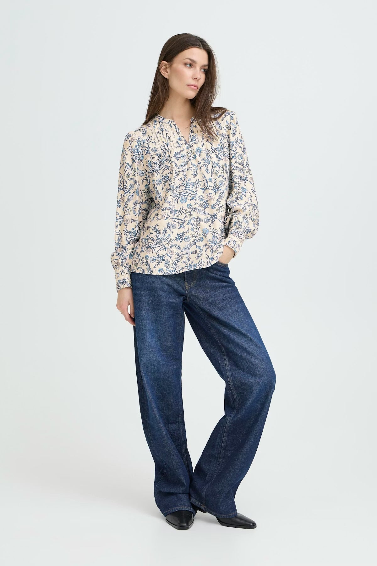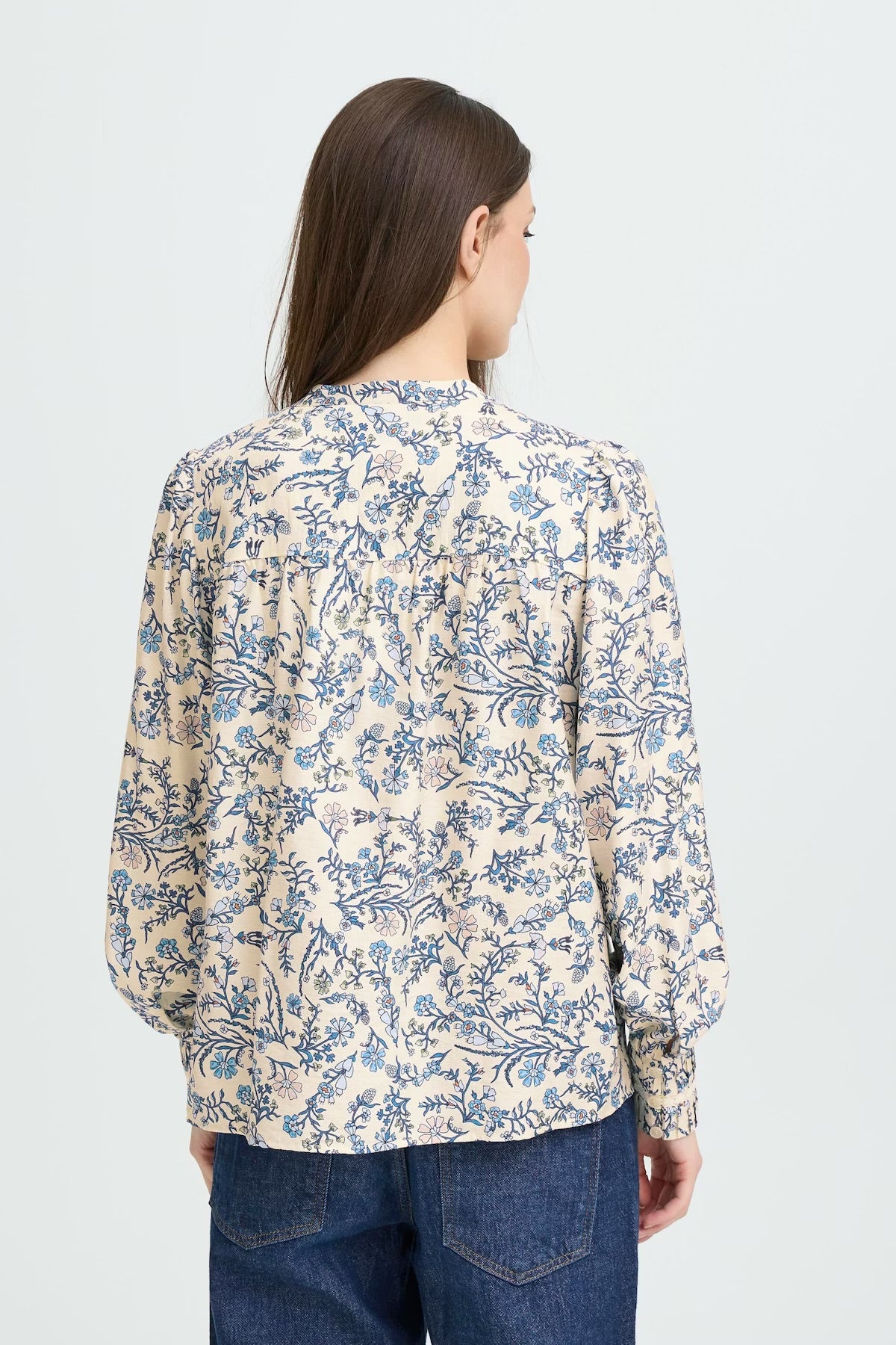 This floral print blouse features a straight silhouette, long sleeves with gathered cuffs, and a split V-neckline accentuated by delicate trim. Soft, lightweight finish enhances its relaxed yet polished effect.