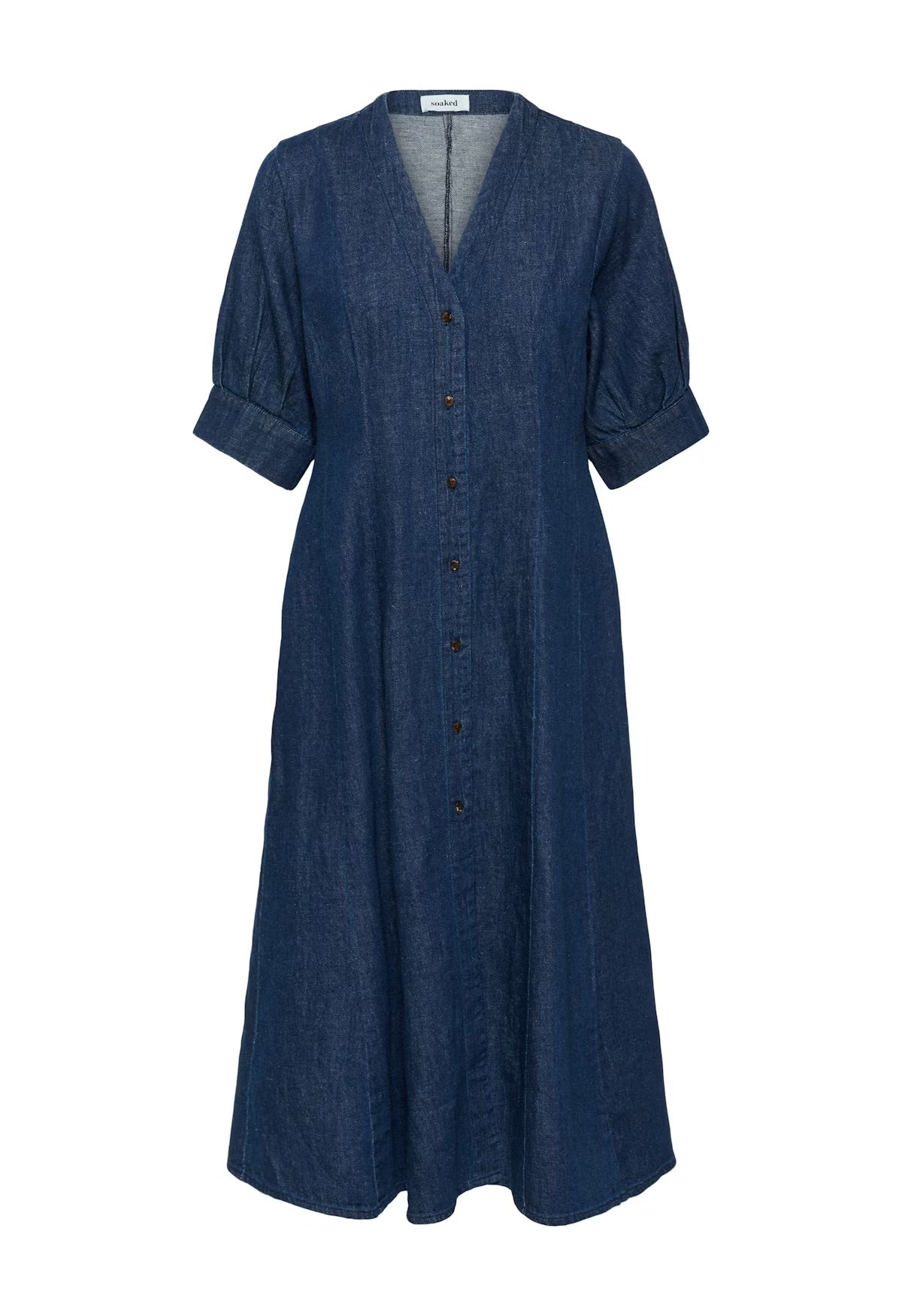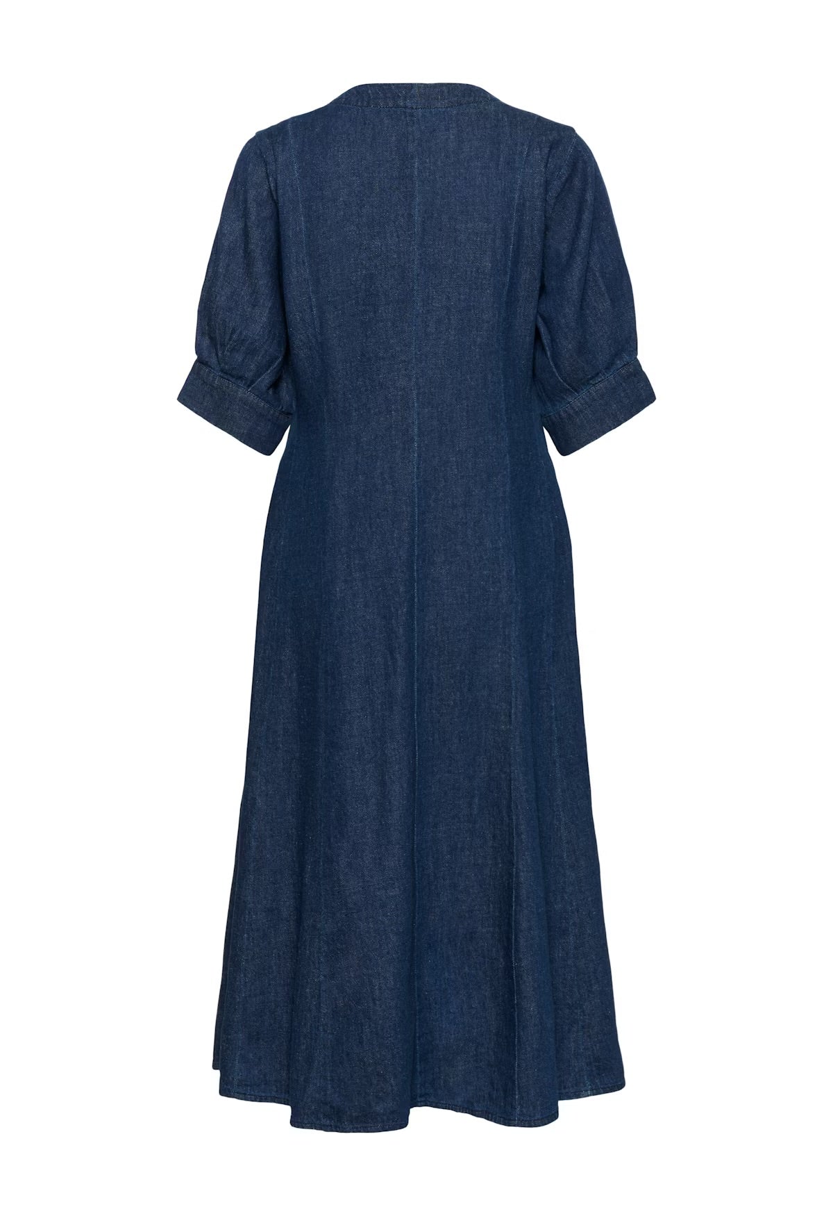 This denim midi dress features a V-neckline, button front, and elbow-length sleeves with turned cuffs. A gently flared silhouette offers easy movement and a timeless, confident