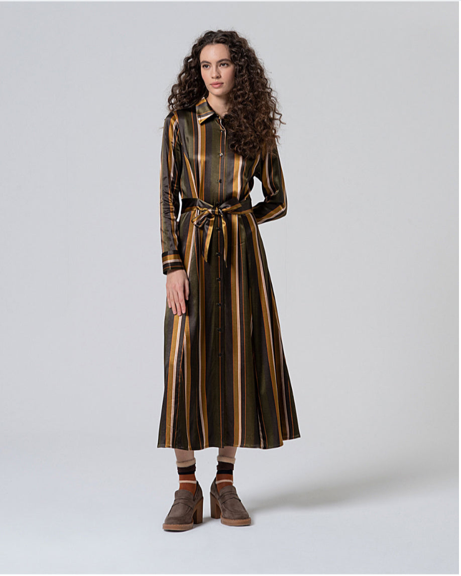 Long shirt dress with belt in the same fabric, made of viscose satin with rayon. Its fluid silhouette and subtle sheen make it an elegant and versatile garment. Ideal to wear open or closed, with boots or flat shoes.