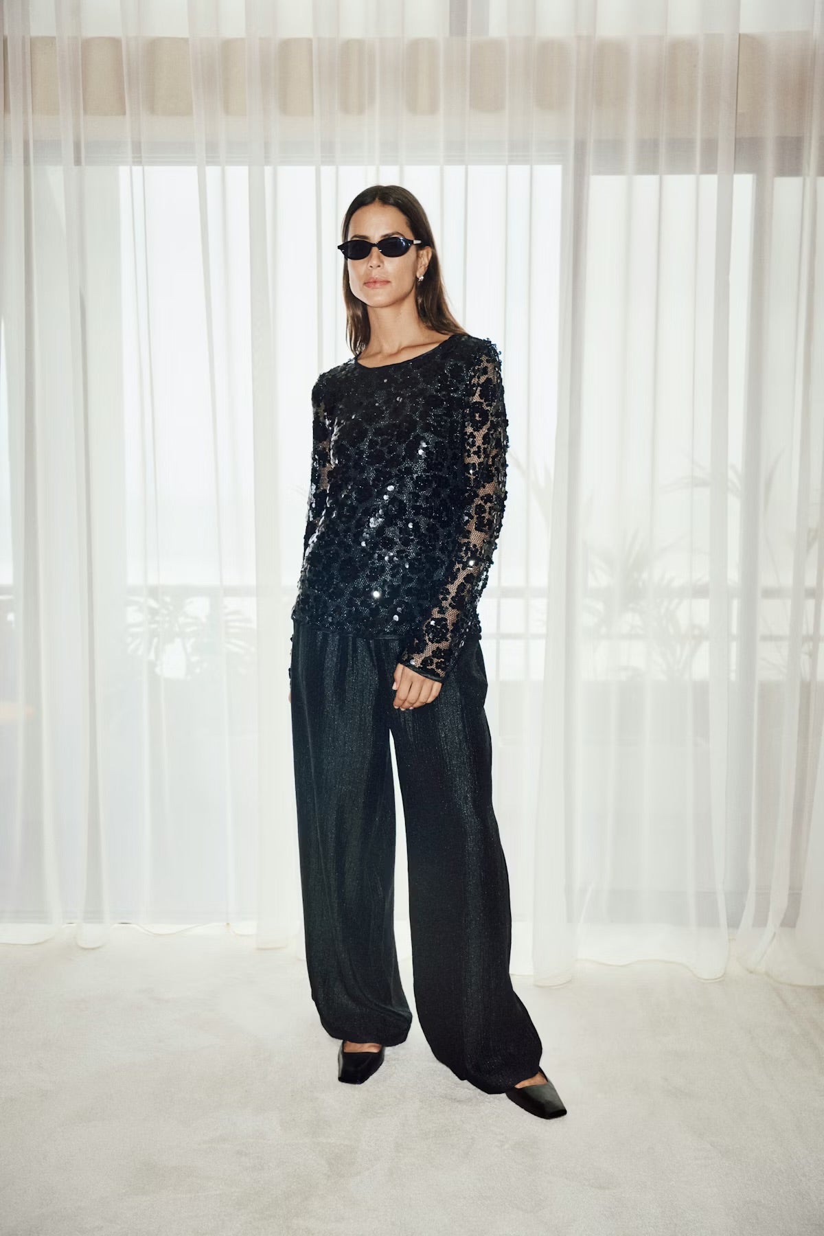 Black sequin top with round neckline and long sleeves in sheer mesh. The shimmering surface adds a festive touch, while the clean silhouette makes it easy to style. Model is wearing size M.
