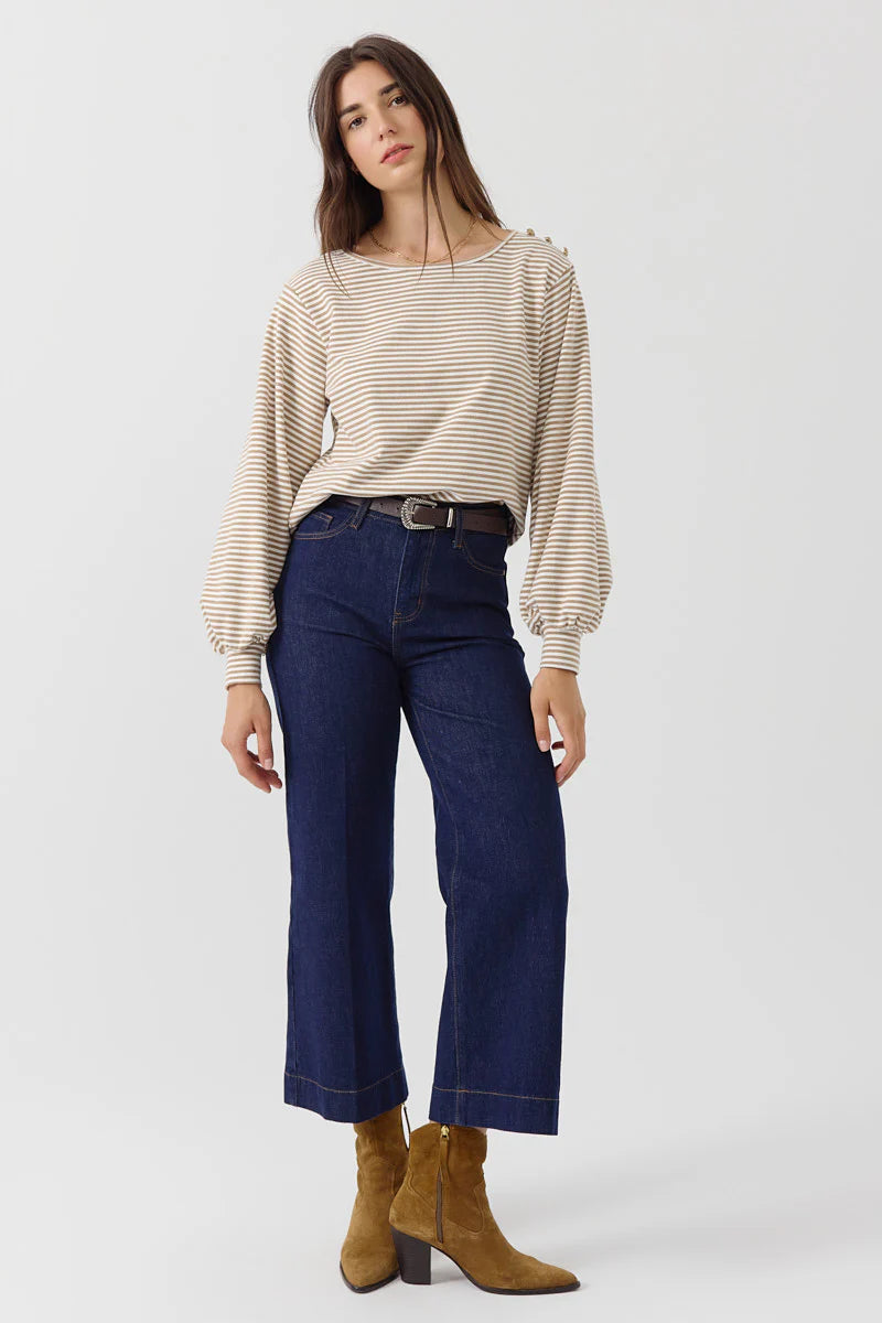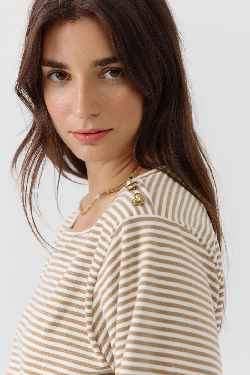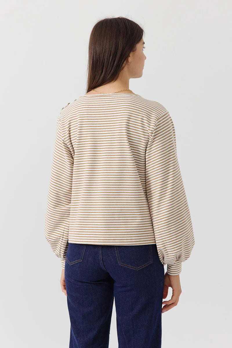 Striped sweatshirt with puff sleeves gathered at the wrists and gold button detail on the left shoulder.