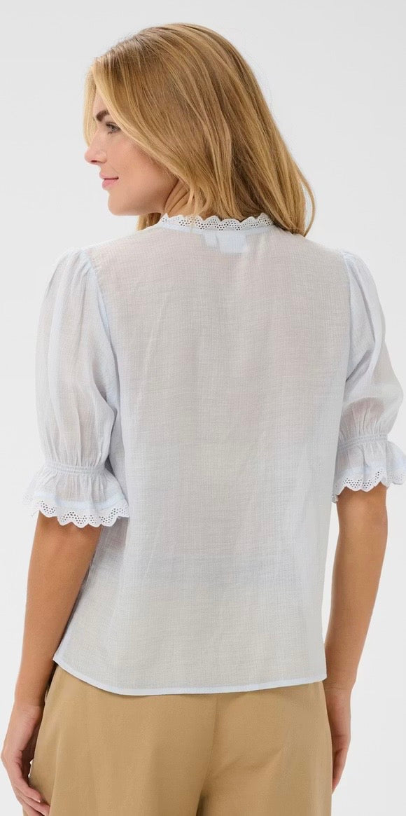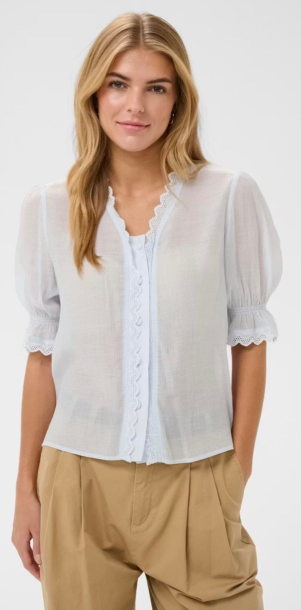Blouse for women with relaxed fit, delicate scalloped neckline, and decorative trim. Features short sleeves with subtle ruffle cuffs. Designed for lasting comfort and versatile styling in any modern wardrobe.
