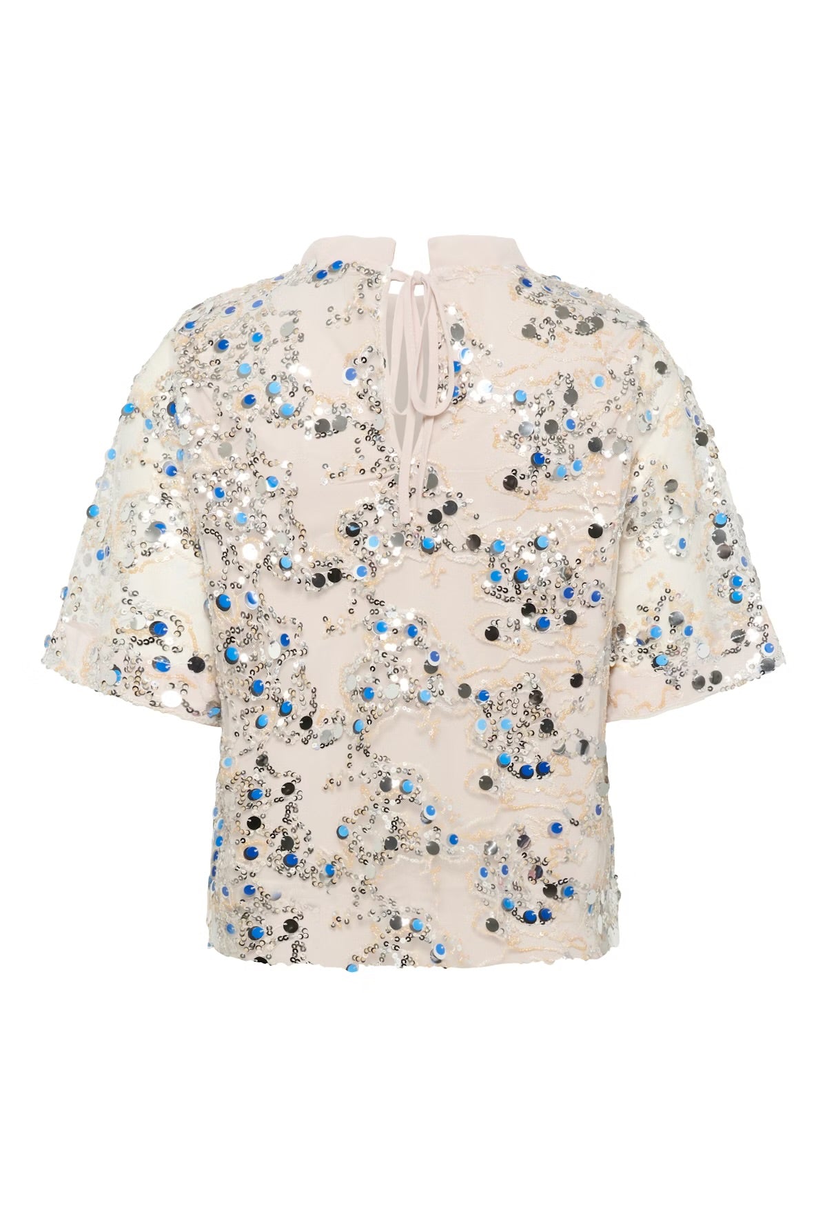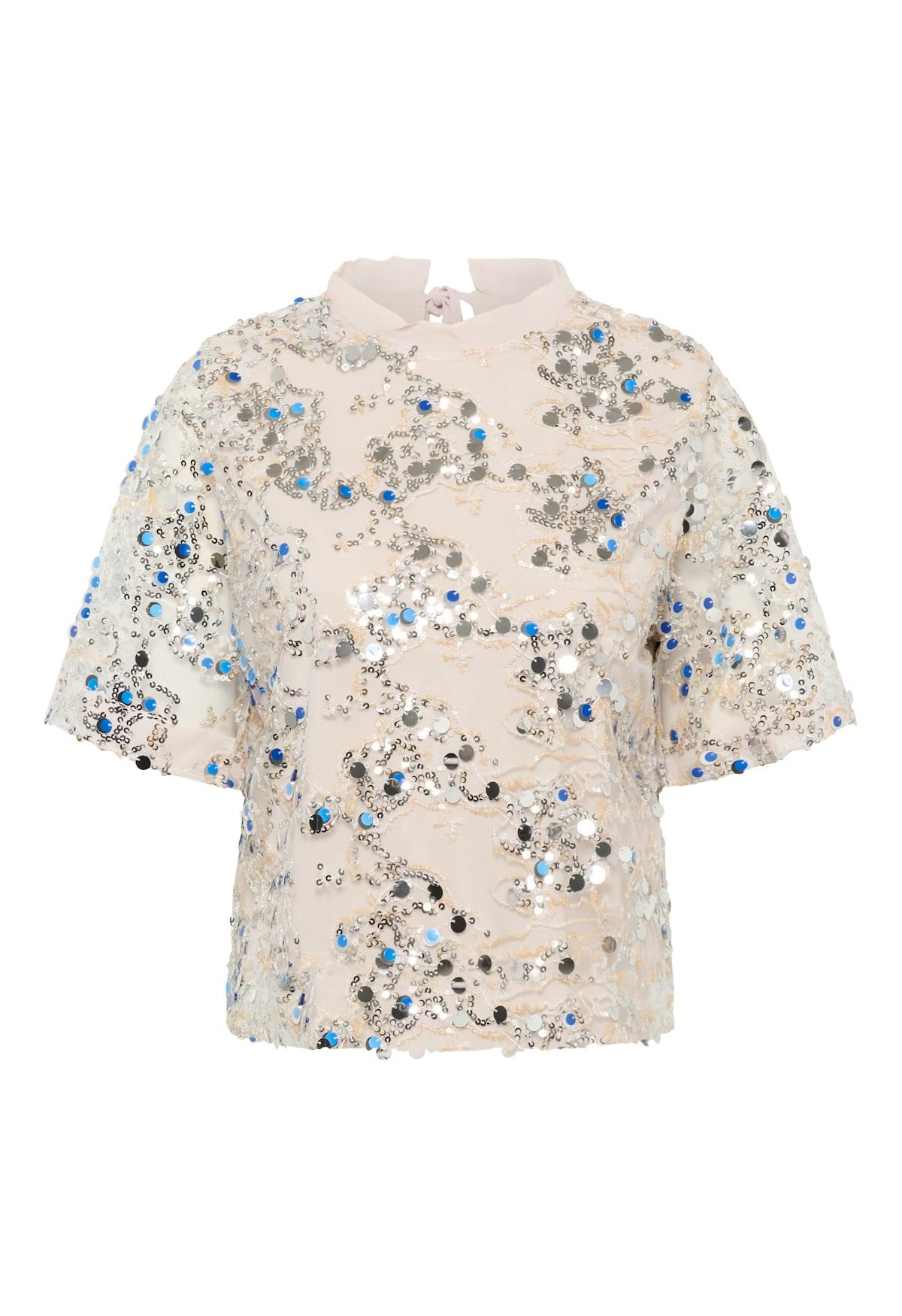Elevate your occasionwear with this elegant sequin top, featuring a relaxed fit, short sleeves, and a classic high neckline. Designed for comfort and refined style, it offers versatile pairing for evening and formal events.