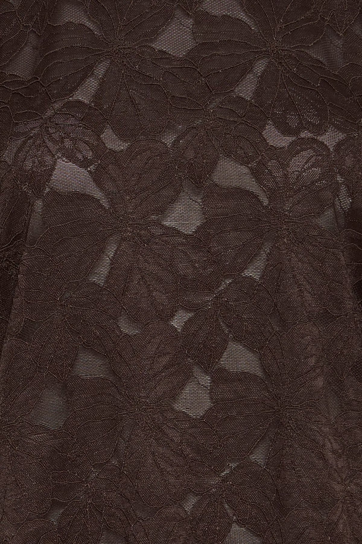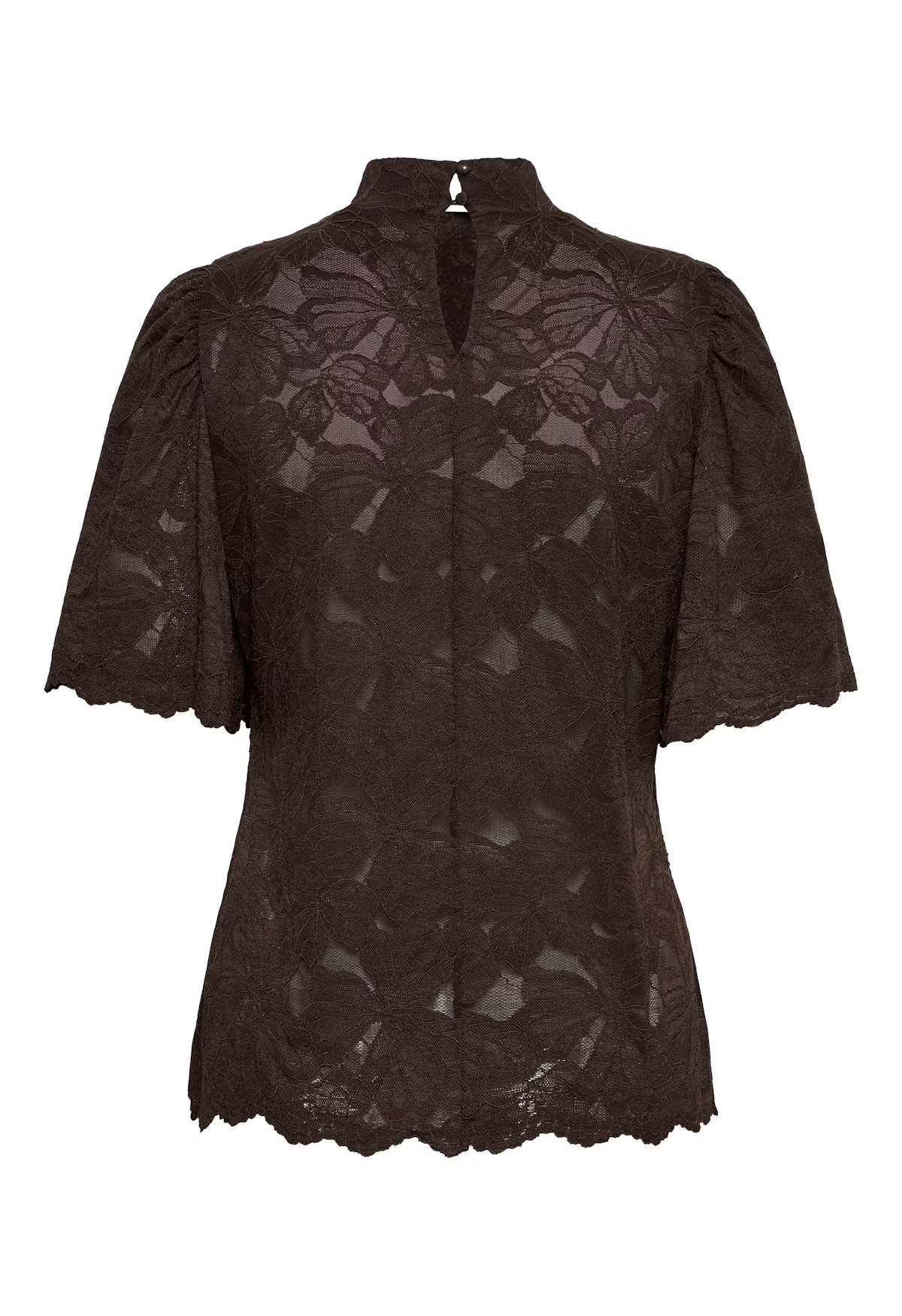 This lace blouse features a loose fit and elegant high neckline, offering comfortable wear and versatile styling. Flared mid-length sleeves and scalloped hems add refined design details for a polished silhouette.