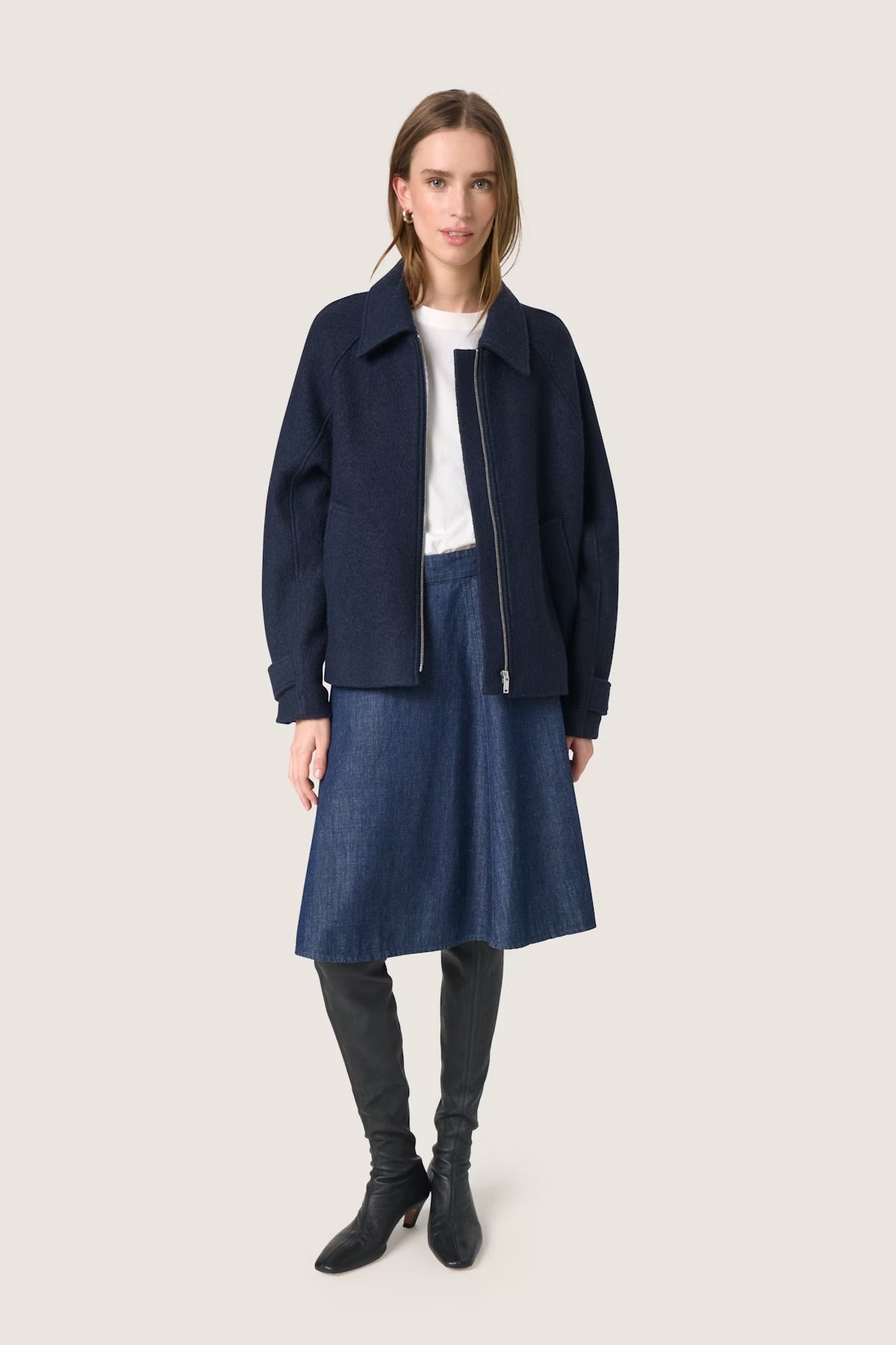 Short jacket in dark navy with a zip closure and defined collar. The relaxed silhouette and fabric containing 50% wool offer warmth and structure to your everyday style. The model is wearing size M.